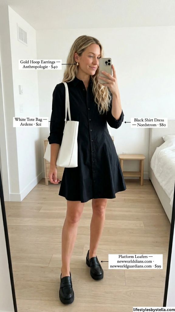 Shop This Look: The Black Shirt Dress is from Nordstrom at $80 — shop it here. The Gold Hoop Earrings by Anthropologie for $40 — grab them here. The White Tote Bag from Ardene at $21 — find it here. And the Platform Loafers at $99 — check them out here.