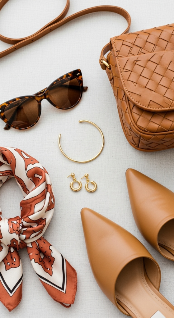 Alt text suggestion: Modest summer outfits accessories including tortoiseshell sunglasses, woven tan bag, gold jewelry, silk scarf, and tan leather mules.