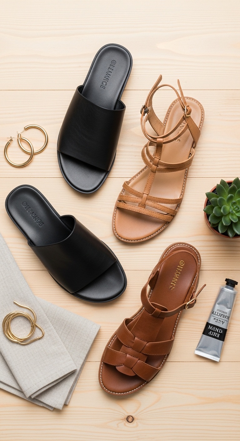 Alt text suggestion: Outfits with sandals flat-lay featuring black leather slides, tan strappy mid-heel sandals, and brown fisherman sandals on a wood surface