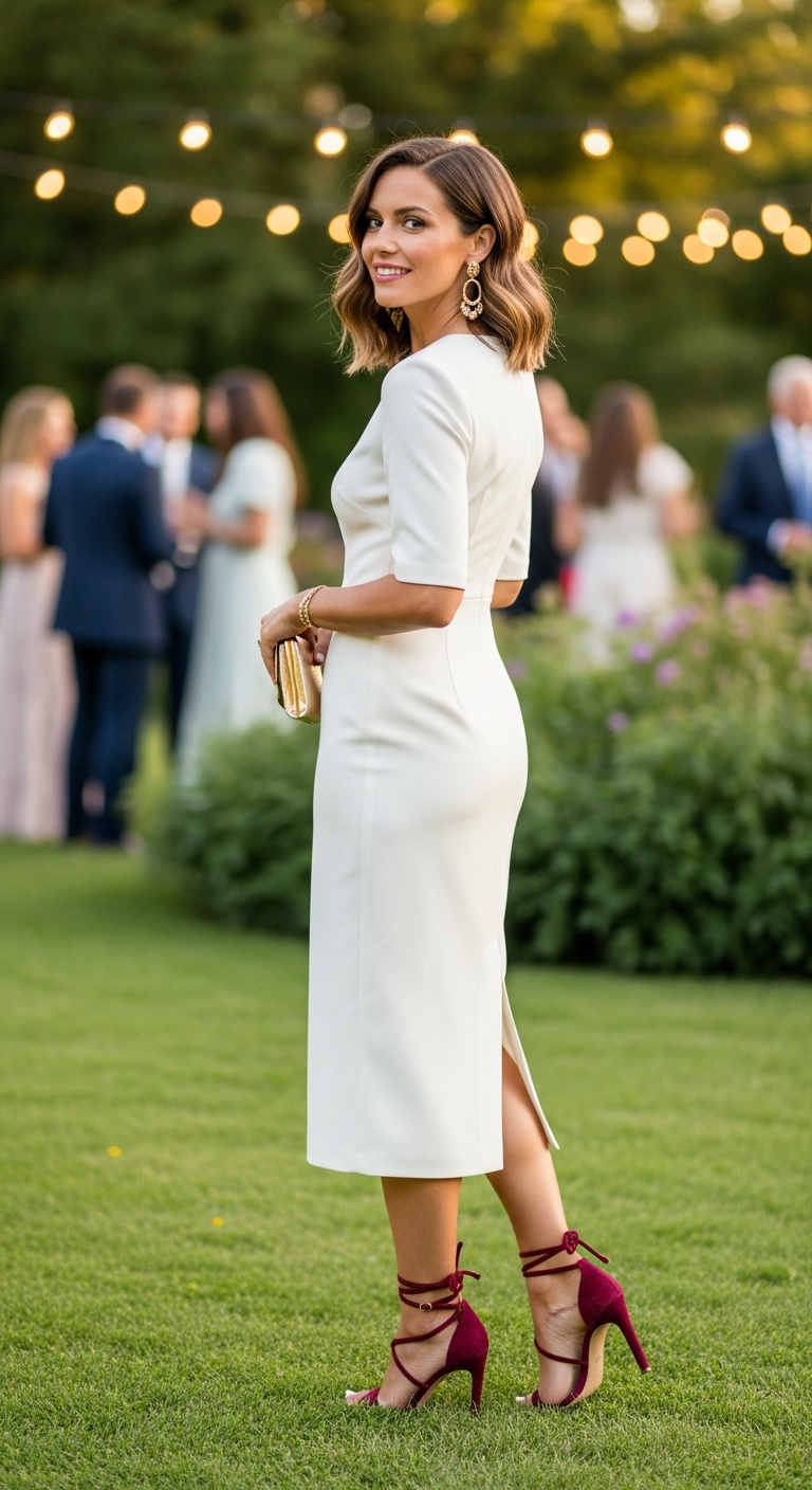 Alt text suggestion: Outfits with sandals dressy garden-party look with an ivory midi dress and burgundy strappy heeled sandals