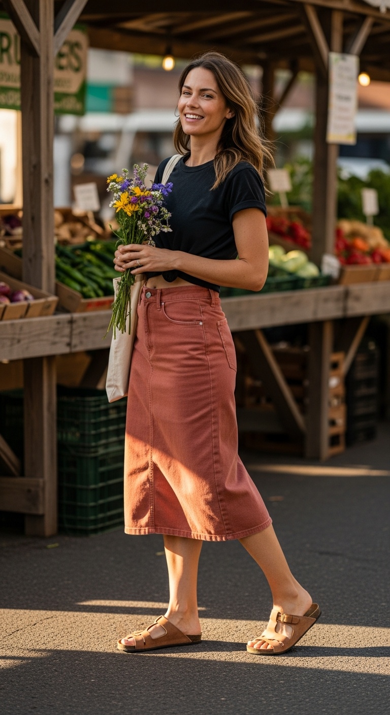 Alt text suggestion: Outfits with sandals look featuring a terracotta midi skirt, black tee, and tan fisherman sandals at an outdoor farmer’s market