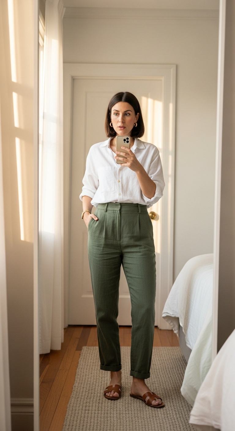 Alt text suggestion: Outfits with sandals mirror outfit featuring a white button-down, olive linen trousers, and brown flat sandals in a bright bedroom