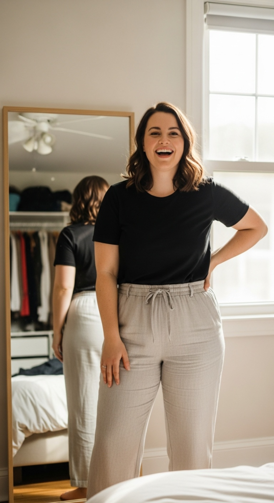 Alt text suggestion: Plus size summer outfit ideas intro with a confident woman in a black tee and linen pants standing in front of a bedroom mirror.