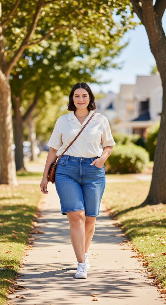 One of my favorite casual plus size summer outfit ideas is a 7-inch denim short with a camp collar shirt, white sneakers, and a crossbody bag. It feels easy, current, and practical. It also looks intentional, which is the secret to making shorts feel less intimidating.