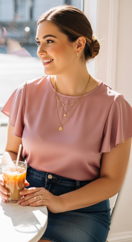 A silky flutter-sleeve blouse tucked into a denim skirt or high-waisted jeans is one of the best polished plus size summer outfit ideas when you want to look like you made an effort without overheating.