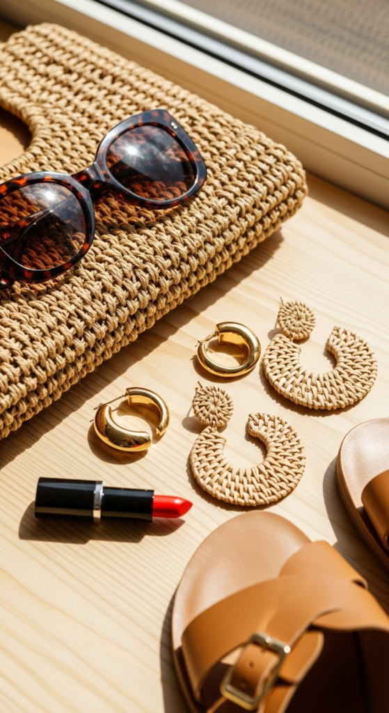 A woven tote instantly gives a simple outfit some texture. Oversized sunglasses add personality and polish. Gold hoops, resin earrings, and raffia statement pieces brighten the face and pull attention upward in a way that genuinely helps the whole outfit feel balanced.