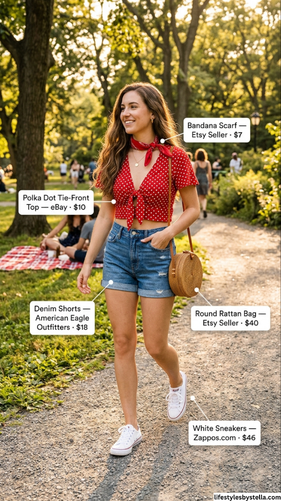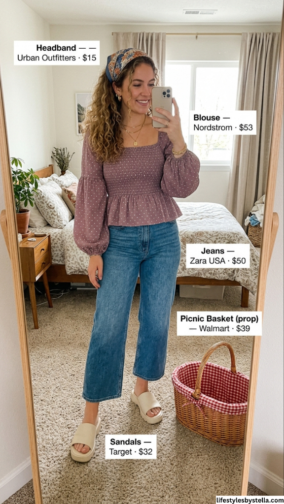 Shop This Look: The Headband is from Urban Outfitters at $15 — shop it here. The Polka Dot Blouse is from Nordstrom at $53 — find it here. The Jeans are from Zara USA at $50 — grab them here. The Picnic Basket is from Walmart at $39 — shop it here. And the Sandals are from Target at $32 — find them here.