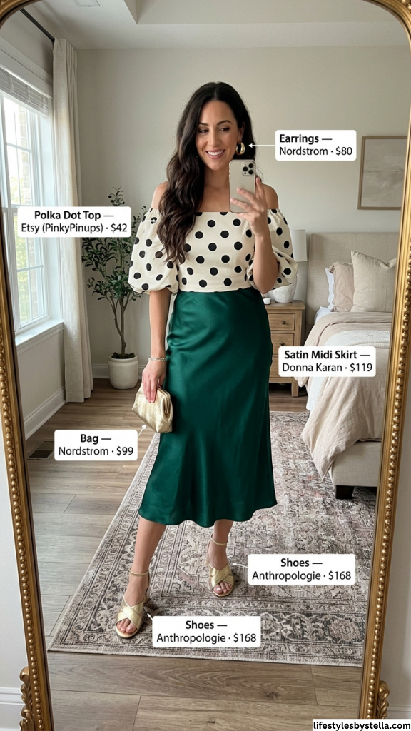 I love when a polka dot blouse gets elevated past casual territory and into something that feels genuinely occasion-worthy. This cream puff-sleeve top with bold black dots is giving all the retro drama — the square neckline, the balloon sleeves, the structured silhouette — but paired with that emerald green satin midi skirt, it becomes something altogether more modern and striking. The color pairing is unexpected and gorgeous. Cream and green is one of those combinations that photographs beautifully and looks even better in person. The satin catches light in a way that makes the whole outfit shimmer without a single sequin in sight.