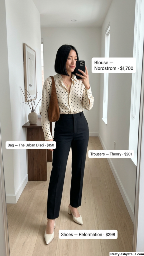 The blouse here is a Nordstrom investment piece at $1,700, which is obviously not an everyday purchase — but if you’re looking for a similar vibe at a lower price point, plenty of retailers carry polka dot button-downs in the $40–$80 range. The Theory trousers, however, are worth every penny. I’ve repurchased Theory pants multiple times because the fit is unmatched.