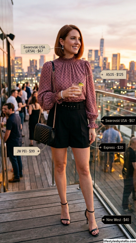 This is hands-down one of my favorite summer polka dots blouse outfits for nights when you want to look like you made an effort without looking like you tried too hard. The sheer fabric keeps the temperature comfortable during humid summer evenings, while the structured shorts add enough edge to balance the femininity. The black-on-mauve color combination reads almost like a sunset, especially against a city skyline. For more after-dark inspiration, check out my roundup of summer going out outfits.