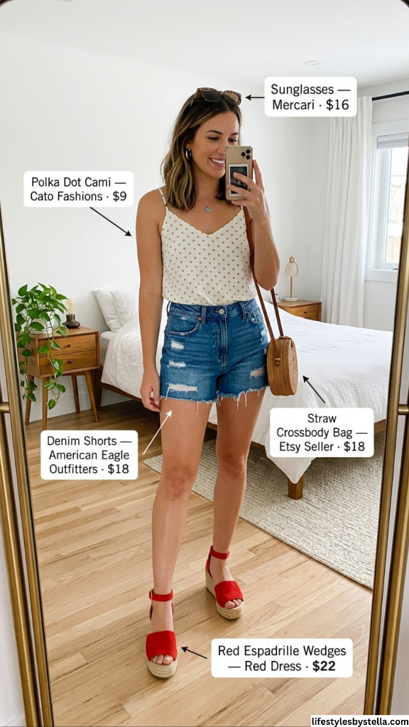 Shop This Look: The Polka Dot Cami is from Cato Fashions at $9 — shop it here. The Sunglasses are from Mercari at $16 — find them here. The Denim Shorts are from American Eagle Outfitters at $18 — grab them here. The Straw Crossbody Bag is from an Etsy seller at $18 — shop it here. And the Red Espadrille Wedges are from Red Dress at $22 — find them here.
