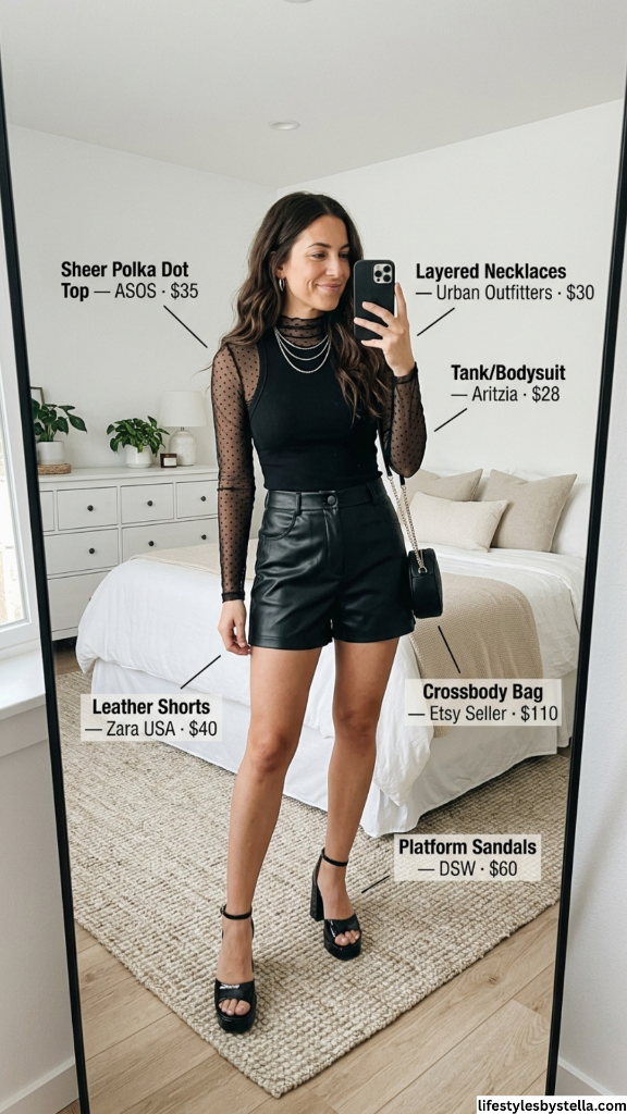 Shop This Look: The Sheer Polka Dot Top is from ASOS at $35 — shop it here. The Layered Necklaces are from Urban Outfitters at $30 — find them here. The Tank/Bodysuit is from Aritzia at $28 — grab it here. The Leather Shorts are from Zara USA at $40 — shop them here. The Crossbody Bag is from an Etsy seller at $110 — find it here. And the Platform Sandals are from DSW at $60 — snag them here.