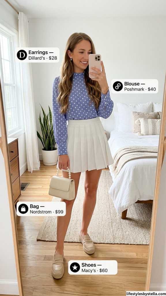 8. Periwinkle Polka Dot Blouse with White Pleated Skirt