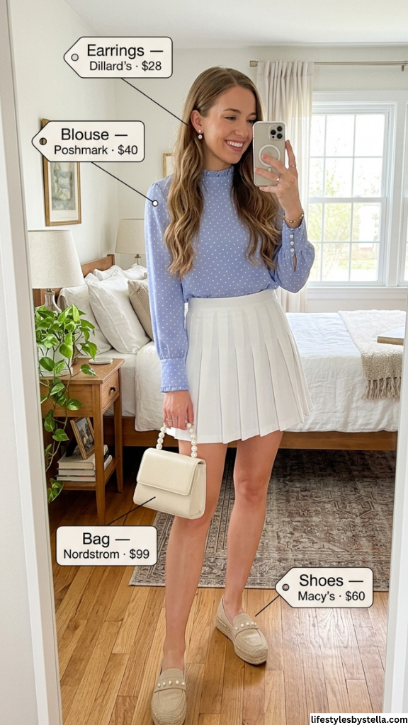 This outfit makes me want to go have lunch at a café and order something with lavender in it. The periwinkle blue polka dot blouse — with its mock neckline, subtle balloon sleeves, and delicate dot pattern — has a sweetness to it that feels very spring-into-summer 2026. Paired with a white pleated tennis skirt, the entire look channels preppy femininity with a modern twist. The colors are soft, the silhouette is playful, and the mood is unapologetically girly. I love it.