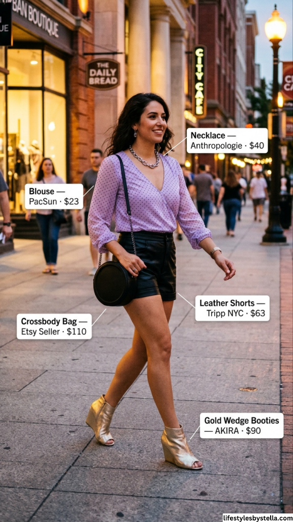 Shop This Look: The Polka Dot Blouse is from PacSun at $23 — shop it here. The Necklace is from Anthropologie at $40 — find it here. The Crossbody Bag is from an Etsy seller at $110 — grab it here. The Leather Shorts are from Tripp NYC at $63 — shop them here. And the Gold Wedge Booties are from AKIRA at $90 — find them here.