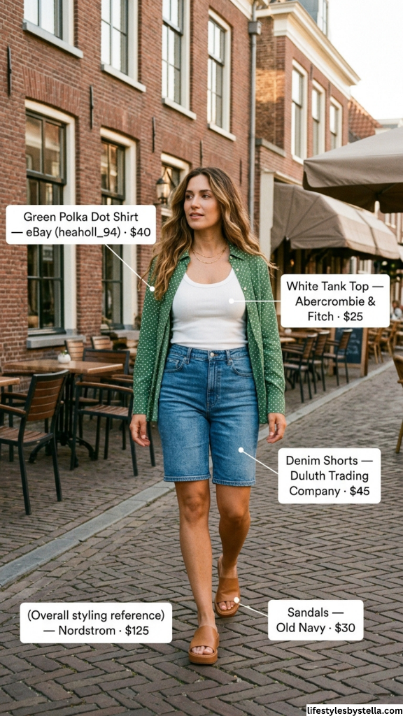 Shop This Look: The Green Polka Dot Shirt is from eBay seller heaholl_94 at $40 — shop it here. The White Tank Top is from Abercrombie & Fitch at $25 — find it here. The Denim Shorts are from Duluth Trading Company at $45 — grab them here. The Sandals are from Old Navy at $30 — shop them here. The overall styling reference is available at Nordstrom for $125 — see more here.