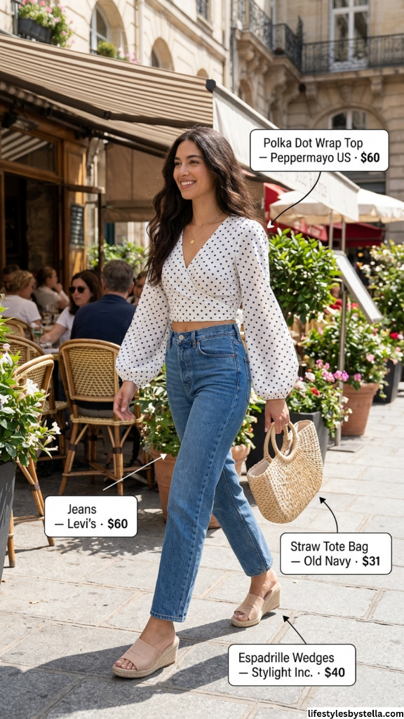 As a women polka dot blouse outfit for summer 2026, this one checks every box. It’s feminine but not fussy. It works for a café lunch, a museum visit, a sunset walk along the river. The espadrille wedges add height while keeping the vibe casual and seasonal, and the straw tote bag is the quintessential warm-weather accessory — functional, chic, and unmistakably summery. If you’ve been scrolling through Miami vacation outfit ideas or planning a Parisian getaway, this look packs beautifully and works in nearly any warm-weather destination.