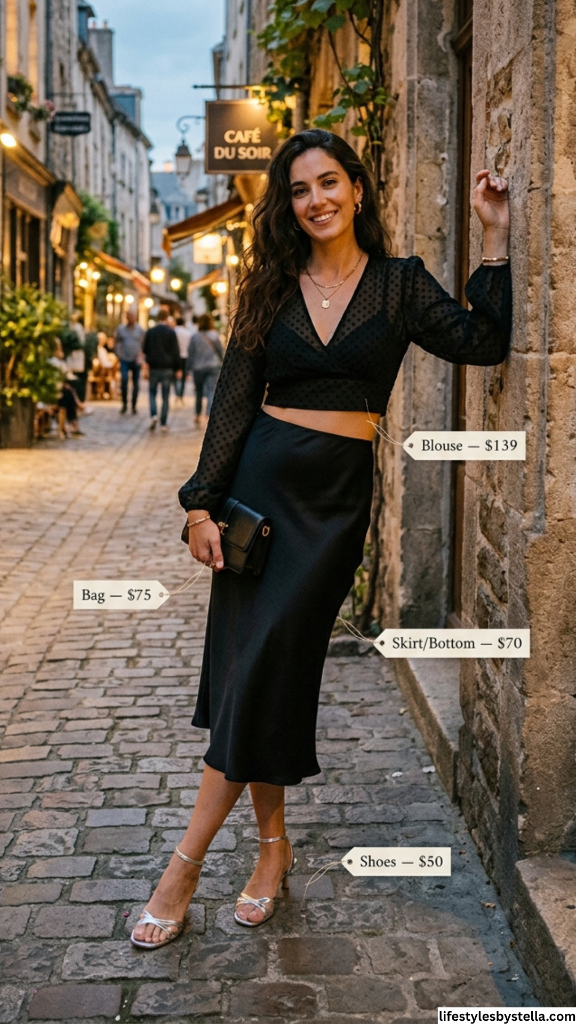 If the emerald satin skirt look from earlier caught your eye, this is its after-dark twin. A black polka dot crop blouse with a deep V-neckline and sheer long sleeves, paired with a flowing black satin midi skirt — the monochromatic approach here is what makes it so striking. Everything is black, but the textures create a rich visual story: the sheer dotted chiffon on the sleeves, the matte crop bodice, the liquid satin of the skirt catching every flicker of candlelight. It’s the kind of outfit that looks almost simple until you get closer and realize how thoughtfully it’s composed.