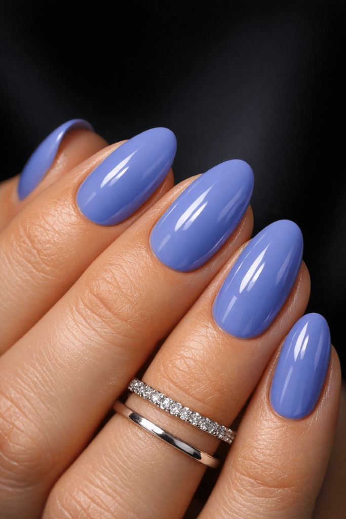 There’s something about periwinkle that just breathes spring. This set takes a creamy blue-violet shade and wraps it around a perfectly shaped almond nail, creating a look that feels polished without trying too hard. The glossy finish catches light in a way that makes each nail look almost liquid — like you dipped your fingertips in a cool spring sky. It’s the kind of shade that reads youthful and sophisticated in equal measure, and with the right application, it has a depth that flat colors simply can’t replicate.