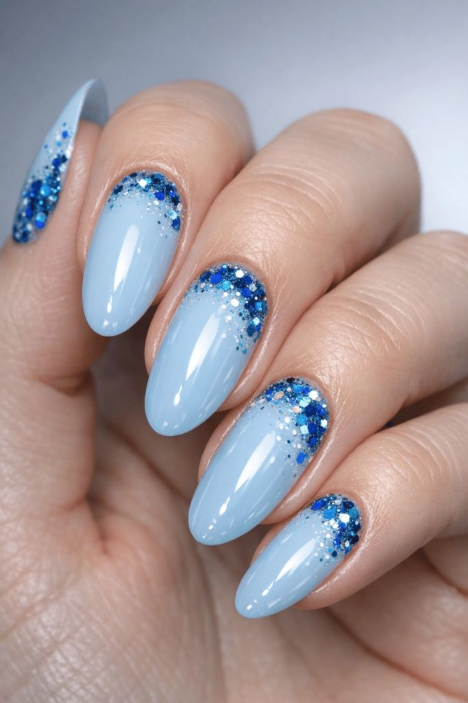 I love when a nail design manages to feel both icy and warm at the same time — and this set pulls that off flawlessly. The base is a pale, almost cloudy blue, smooth and clean with a gorgeous shine. Then, concentrated at the cuticle area, there’s a scattering of deep sapphire and silver glitter that cascades down like tiny gemstones frozen mid-fall. It’s whimsical and polished, like something a winter fairy would wear as she steps into spring.