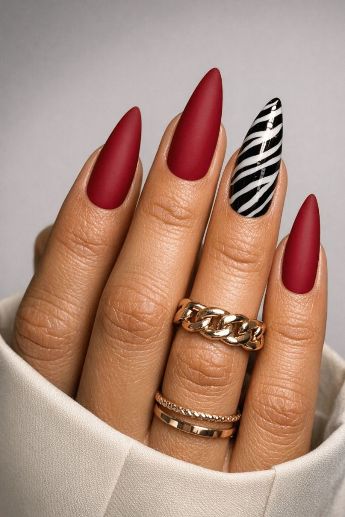 3. Deep Crimson Matte Nails with Zebra Accent Design