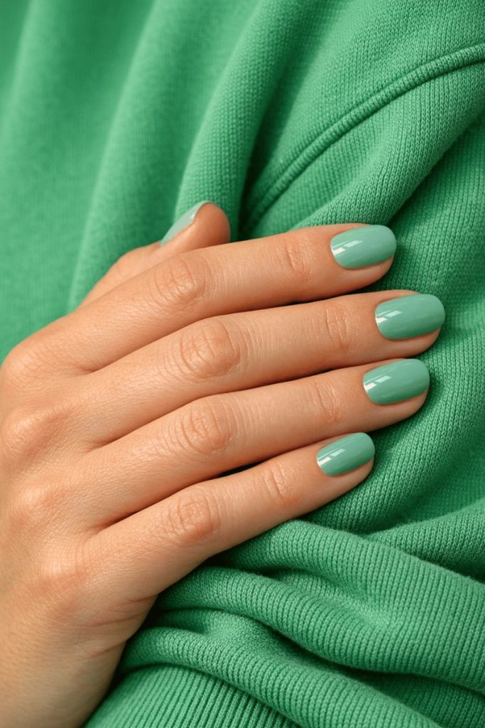 There’s something deeply calming about sage green on short, natural-shaped nails. This design strips away all the noise — no glitter, no art, no accent nails — and lets a single, perfectly chosen color do all the talking. The shade is a muted, slightly dusty green that feels like fresh eucalyptus or the first moss of the season. Against the vibrant green fabric in the background, you can see how versatile this tone really is — it reads earthy, clean, and undeniably spring.