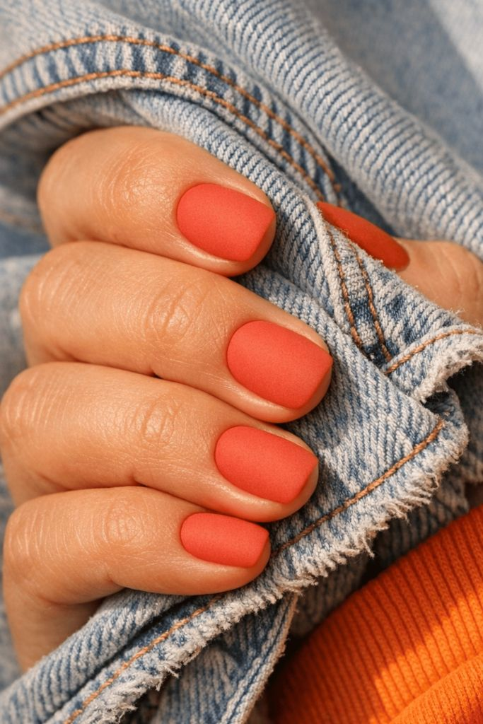 This coral matte set is warm, punchy, and utterly perfect for the first truly sunny days of spring. The color sits somewhere between a ripe peach and a soft red — vivid without being aggressive, cheerful without tipping into neon. The matte finish gives it a velvety texture that photographs like a dream, and the short square shape keeps the overall look grounded and modern. Against the denim fabric in the image, you get that effortless, off-duty-cool vibe that so many of us are chasing.