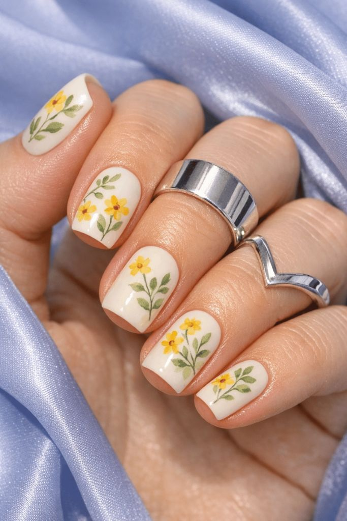 I can never resist a good floral nail, especially when it’s done with this level of delicacy. Each nail here features tiny hand-painted yellow wildflowers with soft green stems on a warm cream base, giving the entire set a cottage-garden feel that’s just impossibly charming. The short, square shape keeps things neat and wearable, while the floral detail adds enough visual interest to make this feel like a miniature work of art on every finger. Against the lavender satin backdrop, the whole mood is romantic and springtime-dreamy.
