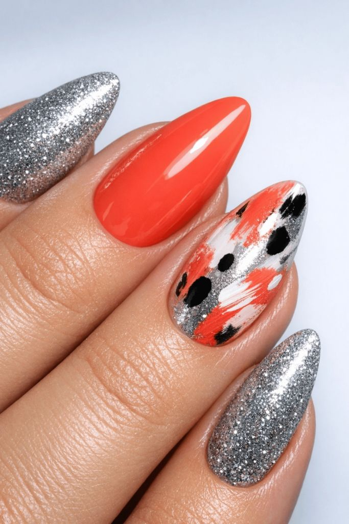 7. Orange and Silver Glitter Art Nails with Abstract Flair