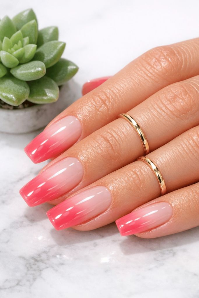 If you’re asking your nail tech for this exact look, request an airbrush ombré application — it creates the smoothest possible transition. Alternatively, a sponge technique with gel polish can achieve a similar result. The marble-and-succulent background in the image gives you a hint of how to style these for photos — natural textures and organic backdrops make pink ombré nails absolutely shine.