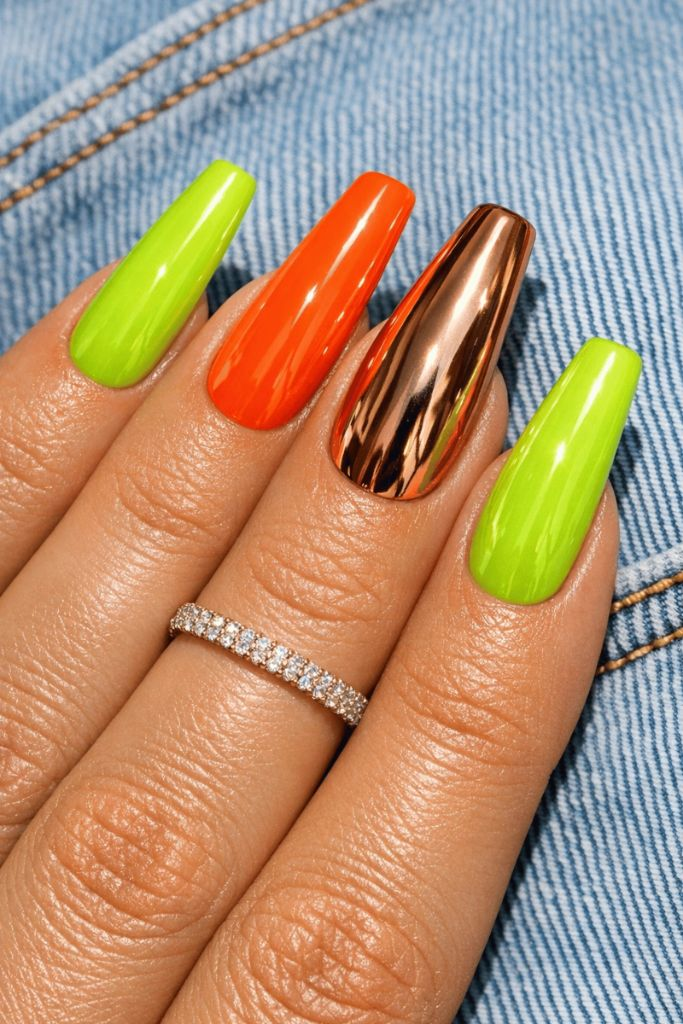 If subtlety isn’t your thing — and honestly, sometimes it shouldn’t be — this neon lime green and copper chrome combination is going to stop you in your tracks. Two nails are coated in an electric, almost highlighter-bright green. One nail is a vivid orange. And then there’s the show-stealer: a chrome copper nail that catches light like liquid metal. The coffin shape and medium-long length give these nails presence, and the denim background just amplifies how electric these colors really are.