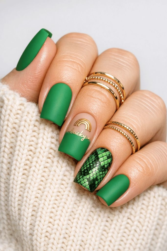 11. Emerald Green Matte Nails with Snakeskin and Lucky Charms