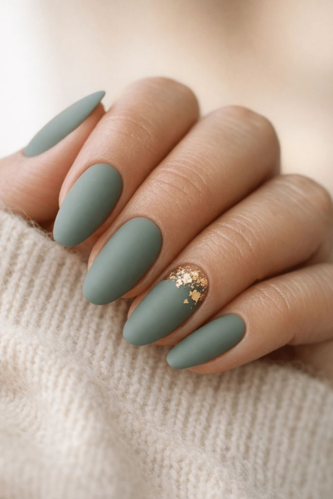 13. Sage Matte Almond Nails with Gold Leaf Accent