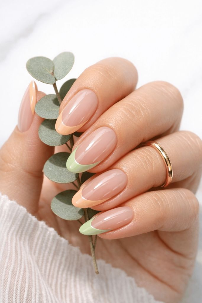 The French manicure has been reinvented about a hundred times now, and honestly, this pastel green version might be my favorite iteration yet. A sheer, natural-looking base coats the almond nails, and the tips are finished in a soft pistachio green — not quite mint, not quite sage, but something in between that feels entirely springlike. The hand is holding a sprig of eucalyptus, and the color coordination is so perfect it almost looks intentional by nature itself.