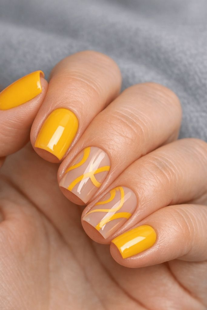 Yellow nails are having a renaissance, and this set shows exactly why. Two nails are painted in a rich, warm mustard — glossy and saturated — while the middle nails feature a nude base with flowing, abstract yellow lines that swirl and intersect like a modern art sketch. The short, natural nail shape keeps the whole thing approachable, and the combination of bold color with delicate linework creates a tension that’s visually fascinating.