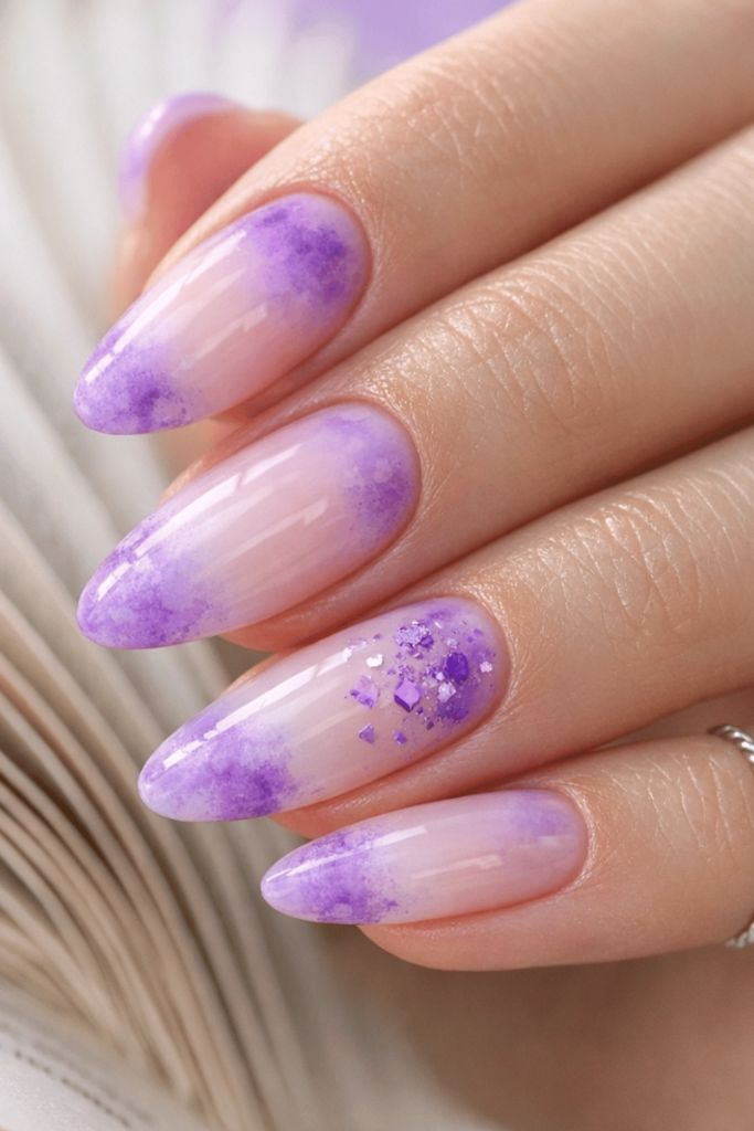 Purple spring nails are absolutely everywhere in 2026, and this watercolor set might be the most ethereal interpretation I’ve seen. The base is a sheer, milky pink, and washes of soft violet are diffused across the surface like someone gently breathed watercolor pigment onto each nail. One accent nail features scattered purple glitter chunks — tiny, imperfect, beautiful. The almond shape elongates everything, and the overall effect is dreamy, romantic, and completely mesmerizing.