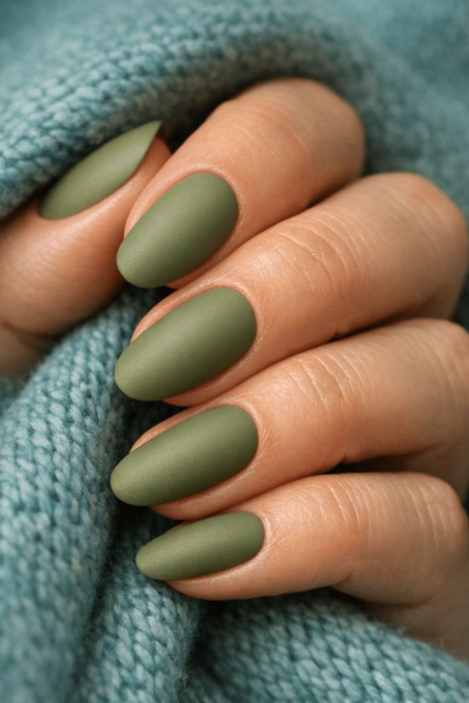 Olive green in matte is the quiet rebel of spring 2026 nail trends. This set features a rich, warm olive shade on oval nails — slightly longer than short, slightly shorter than medium — wrapped in a teal knit that highlights the green-brown undertones beautifully. There’s no art, no accent, no distraction. Just pure, confident color worn in a finish that makes it feel like suede on your fingertips. It’s earthy, grounded, and impossibly chic.