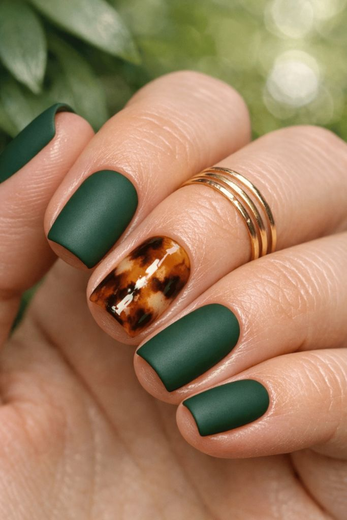 19. Forest Green Matte Nails with Tortoiseshell Accent