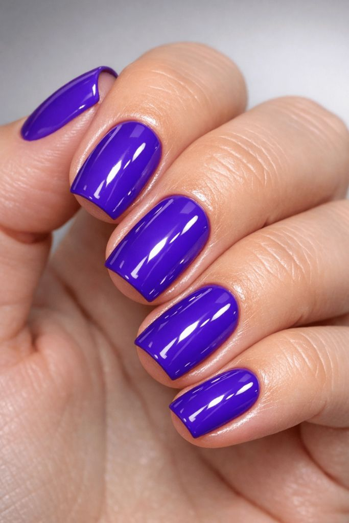 We’re ending on a high note — literally. This saturated, electric violet on short square nails is the kind of color that makes a room take notice. It’s deeper than lavender, bolder than periwinkle, and completely committed to being purple. The glossy finish amplifies the vibrancy to an almost jewel-like intensity, and the short, clean shape lets the color be the hero without any competing design elements. It’s simple. It’s striking. It’s spring in its most confident form.
