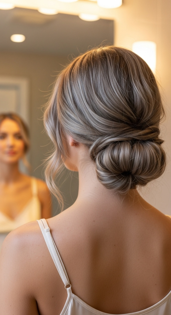 Alt text suggestion: Spring hair colors 2026 milky brunette in a loose low bun with soft diffused cool brown tones.