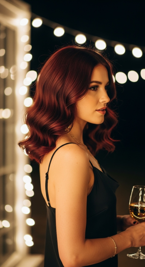 Alt text suggestion: Spring hair colors 2026 cherry cola glaze with glossy wine-toned waves under warm evening lights.