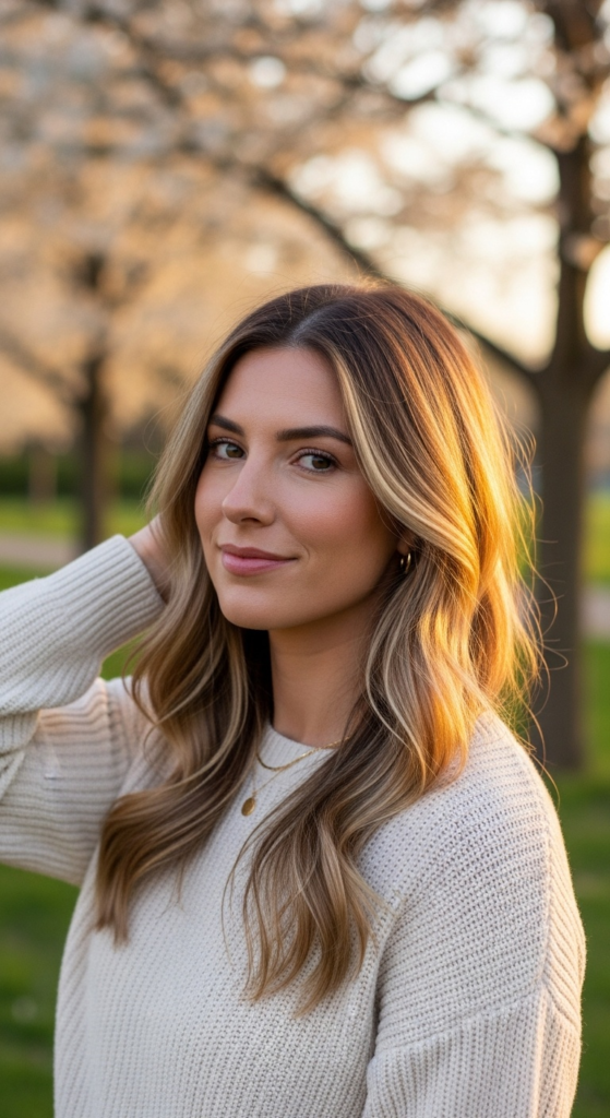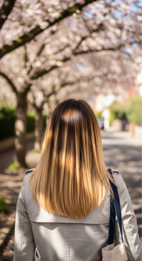 Alt text suggestion: Spring hair colors 2026 seamless balayage from a deeper root to lighter warm ends on a spring tree-lined street.