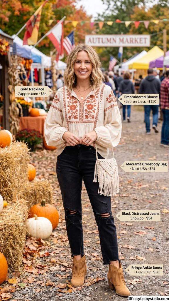 I love when an outfit tells a story — and this one feels like a page from someone’s travel journal. A cream embroidered blouse with warm terracotta floral detailing, tucked loosely into black distressed straight-leg jeans, finished with suede fringe ankle boots and a macramé crossbody bag. It’s boho without being costume-y. It’s textured without being cluttered. And that embroidery work? The kind of artisan detail that makes a simple blouse feel like a treasure you found at a market overseas.