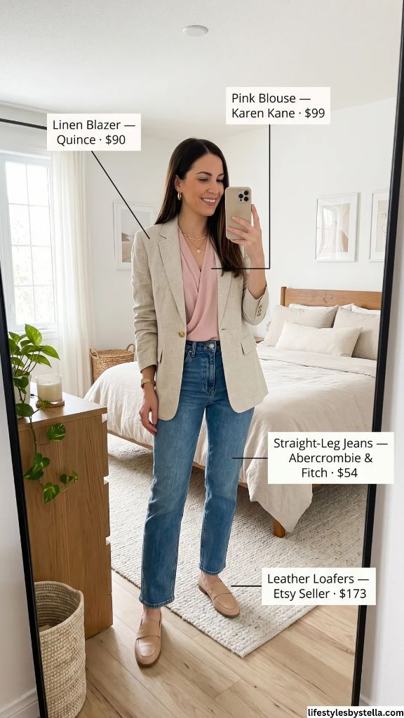 Shop This Look: The Linen Blazer is from Quince at $90 — shop it here. The Pink Blouse by Karen Kane for $99 — grab it here. The Straight-Leg Jeans from Abercrombie & Fitch at $54 — find them here. And the Leather Loafers from an Etsy Seller at $173 — browse them here.