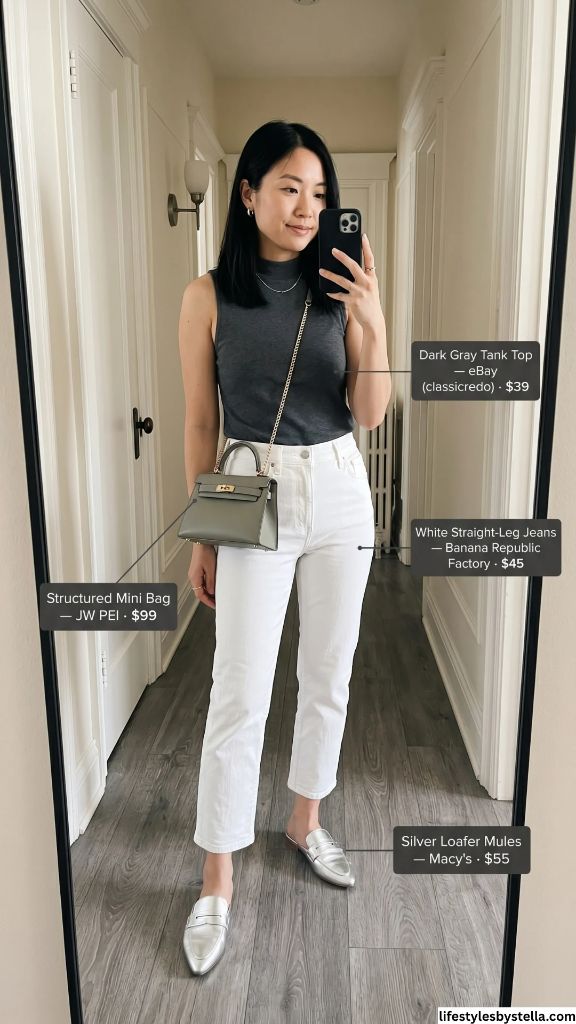 Shop This Look: The Dark Gray Tank Top is from eBay (classicredo) at $39 — shop it here. The White Straight-Leg Jeans from Banana Republic Factory at $45 — find them here. The Structured Mini Bag by JW PEI for $99 — grab it here. And the Silver Loafer Mules from Macy’s at $55 — check them out here.