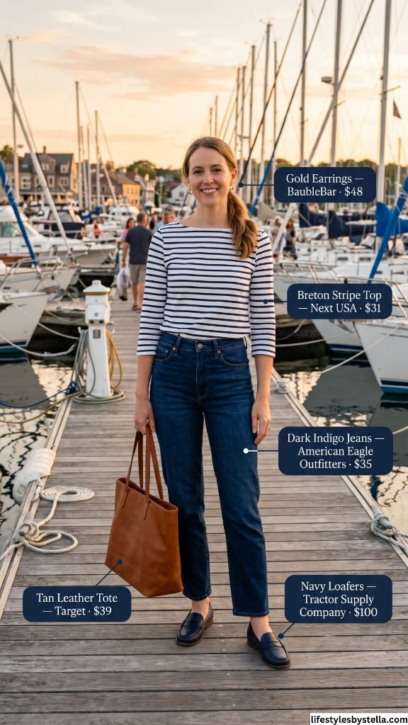 Shop This Look: The Gold Earrings are from BaubleBar at $48 — shop them here. The Breton Stripe Top from Next USA at $31 — find it here. The Dark Indigo Jeans from American Eagle Outfitters at $35 — grab them here. The Tan Leather Tote from Target at $39 — check it out here. And the Navy Loafers from Tractor Supply Company at $100 — shop them here.