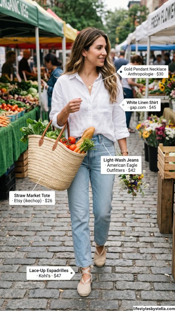 Shop This Look: The Gold Pendant Necklace is from Anthropologie at $30 — shop it here. The White Linen Shirt from Gap at $45 — find it here. The Light-Wash Jeans from American Eagle Outfitters at $42 — grab them here. The Straw Market Tote from Etsy (ikechop) at $26 — check it out here. And the Lace-Up Espadrilles from Kohl’s at $47 — shop them here.