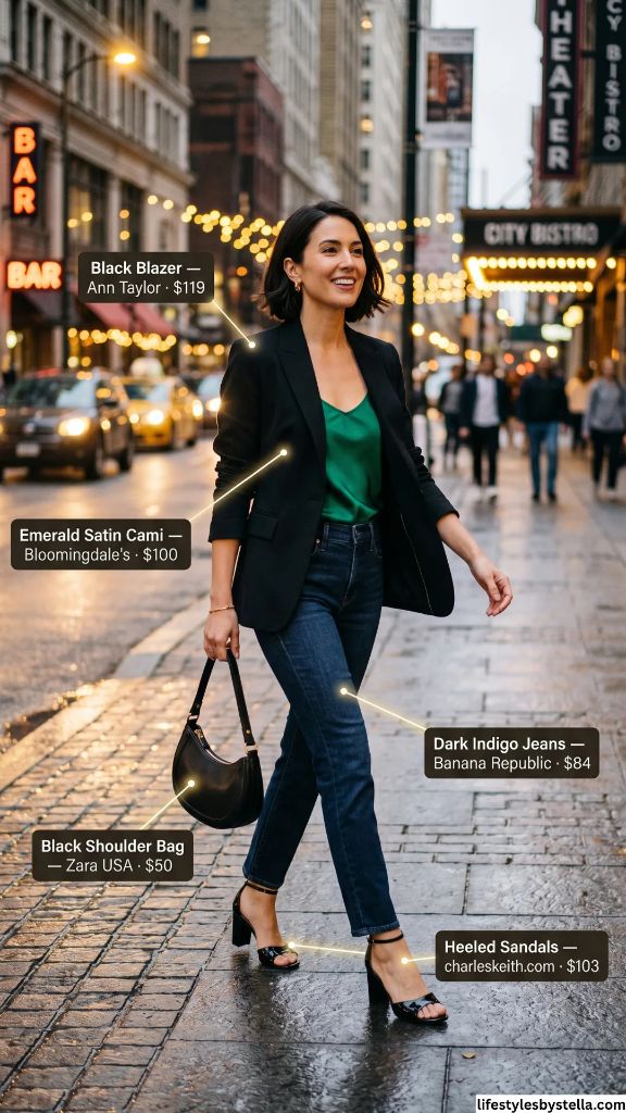 Shop This Look: The Black Blazer is from Ann Taylor at $119 — shop it here. The Emerald Satin Cami from Bloomingdale’s at $100 — find it here. The Dark Indigo Jeans by Banana Republic for $84 — grab them here. The Black Shoulder Bag from Zara USA at $50 — check it out here. And the Heeled Sandals from Charles & Keith at $103 — shop them here.