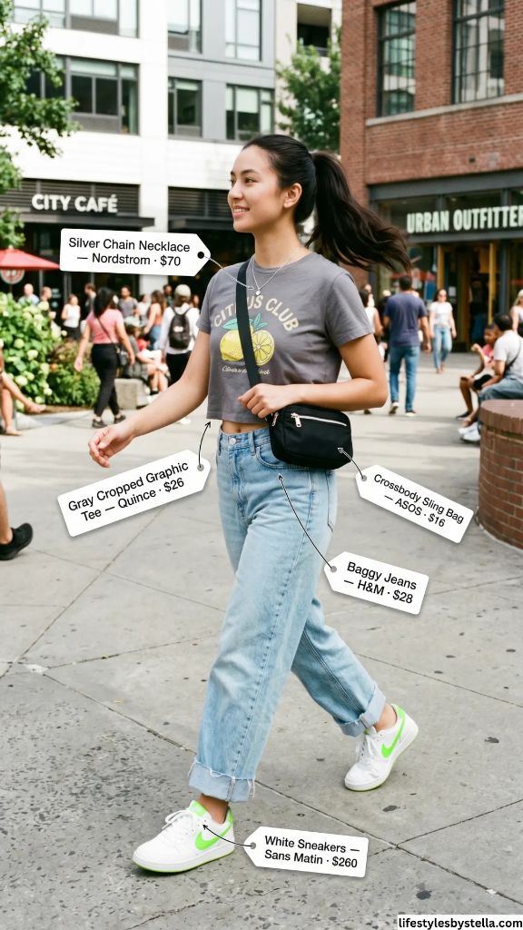 Shop This Look: The Silver Chain Necklace is from Nordstrom at $70 — shop it here. The Gray Cropped Graphic Tee from Quince at $26 — find it here. The Crossbody Sling Bag from ASOS at $16 — grab it here. The Baggy Jeans from H&M at $28 — check them out here. And the White Sneakers from Sans Matin at $260 — shop them here.