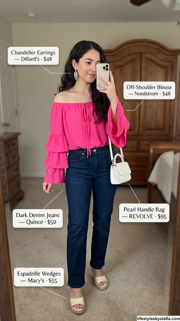 Shop This Look: The Chandelier Earrings are from Dillard’s at $48 — shop them here. The Off-Shoulder Blouse is from Nordstrom at $48 — find it here. The Dark Denim Jeans from Quince at $50 — grab them here. The Pearl Handle Bag by REVOLVE for $95 — shop it here. And the Espadrille Wedges from Macy’s at $55 — check them out here.